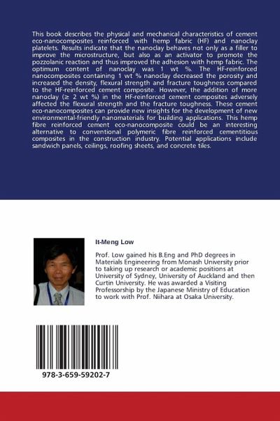 This book describes the physical and mechanical characteristics of cement eco-nanocomposites reinforced with hemp fabric (HF) and nanoclay platelets. Results indicate that the nanoclay behaves not only as a filler to improve the microstructure, but also as an activator to promote the pozzolanic reaction and thus improved the adhesion with hemp fabric. The optimum content of nanoclay was 1 wt %. The HF-reinforced nanocomposites containing 1 wt % nanoclay decreased the porosity and increased the density, flexural strength and fracture toughness compared to the HF-reinforced cement composite. However, the addition of more nanoclay ( 2 wt %) in the HF-reinforced cement composites adversely affected the flexural strength and the fracture toughness. These cement eco-nanocomposites can provide new insights for the development of new environmental-friendly nanomaterials for building applications. This hemp fibre reinforced cement eco-nanocomposite could be an interesting alternative to conventional polymeric fibre reinforced cementitious composites in the construction industry. Potential applications include sandwich panels, ceilings, roofing sheets, and concrete tiles.