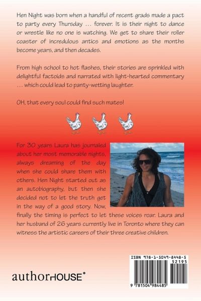 Hen Night was born when a handful of recent grads made a pact to party every Thursday ... forever. It is their night to dance or wrestle like no one is watching. We get to share their roller coaster of incredulous antics and emotions as the months become years, and then decades. From high school to hot flashes, their stories are sprinkled with delightful factoids and narrated with light-hearted commentary ... which could lead to panty-wetting laughter. OH, that every soul could find such mates!