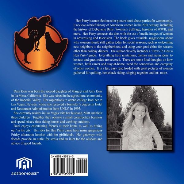 Hen Party is a non-fiction color picture book about parties for women only. It reviews a brief history of American women in the 20th century, including the history of Debutante Balls, Women's Suffrage, heroines of WWII, and more. Hen Party connects the dots with the use of media images of women in advertising and television. The book gives valuable suggestions about why women should still gather today for social reasons, such as welcoming new neighbors to the neighborhood, and using your good china for reasons other than holiday dinners. The author cleverly includes a 'How-To Host a Hen Party' guide. Everything from invitations, themes and menu ideas, to hostess and guest rules are covered. There are some final thoughts on how women, both career and stay-at-home, need the connection and company of other women. It is a fun, easy read loaded with great pictures of women gathered for quilting, horseback riding, singing together and lots more.