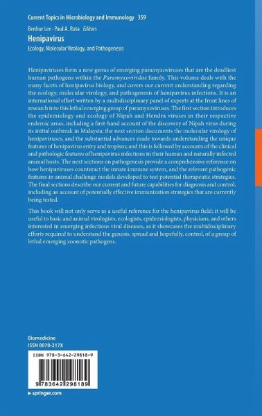 This book will not only serve as a useful reference for the henipavirus field; it will be useful to basic and animal virologists, ecologists, epidemiologists, physicians, and others interested in emerging infectious viral diseases, as it showcases the multidisciplinary efforts required to understand the genesis, spread and hopefully, control, of a group of lethal emerging zoonotic pathogens.