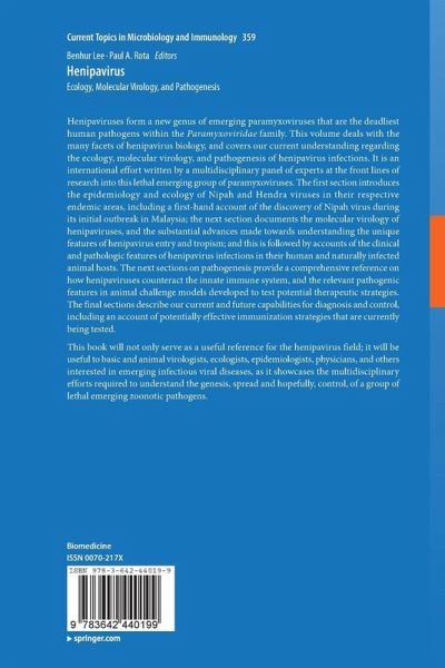 This book will not only serve as a useful reference for the henipavirus field; it will be useful to basic and animal virologists, ecologists, epidemiologists, physicians, and others interested in emerging infectious viral diseases, as it showcases the multidisciplinary efforts required to understand the genesis, spread and hopefully, control, of a group of lethal emerging zoonotic pathogens.