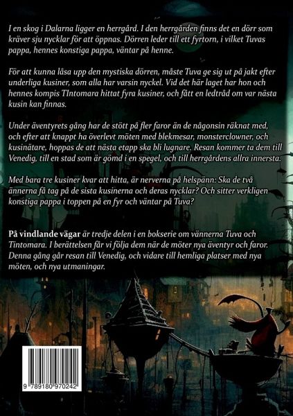I en skog i Dalarna ligger en herrgård. I den herrgården finns det en dörr som kräver sju nycklar för att öppnas. Dörren leder till ett fyrtorn, i vilket Tuvas pappa, hennes konstiga pappa, väntar på henne. För att kunna låsa upp den mystiska dörren, måste Tuva ge sig ut på jakt efter underliga kusiner, som alla har varsin nyckel. Vid det här laget har hon och hennes kompis TIntomara hittat fyra kusiner, och fått en ledtråd om var nästa kusin kan finnas. Under äventyrets gång har de stött på fler faror än de någonsin räknat med, och efter att knappt ha överlevt möten med blekmesar, monsterclowner, och kusinätare, räknar de inte med att resans sista etapp ska bli lättare. Nästa etapp går till Venedig, där de ska leta efter en hemlighetsfull cirkus, och förhoppningsvis även hitta nästa kusin. Med bara tre kusiner kvar att hitta, är nerverna på helspänn: Ska de två vännerna få tag på de sista kusinerna och deras nycklar? Och sitter verkligen konstiga pappa i toppen på en fyr och väntar på Tuva? Vindlande städer är tredje delen i en bokserie om vännerna Tuva och Tintomara. I berättelsen får vi följa dem när de möter nya äventyr och faror. Denna gång går resan till Venedig, och vidare till hemliga platser med nya vänner, och nya motgångar. Med bara tre kusiner kvar att finna, kan de två vännerna börja se slutet på resan, frågan är ifall de lyckas ta sig dit helskinnade.