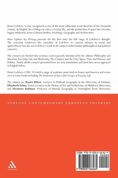 Henri Lefebve: Key Writings presents for the first time the full range of Lefebvre's thought. The selection reinforces the centrality of Lefebvre to current debates in social and spatial theory but also sets Lefebvre's work in the context of his broader philosophical and political concerns.The extracts are divided into sections, each separately introduced by the editors: Philosophy and Marxism; Everyday Life and Modernity; The Country and the City; Space, Time and History; Politics. Nearly all the extracts presented here are new translations and most have never appeared in English before.