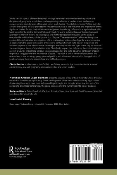 While certain aspects of Henri Lefebvre's writings have been examined extensively within the disciplines of geography, social theory, urban planning and cultural studies, there has been no comprehensive consideration of his work within legal studies. Henri Lefebvre: Spatial Politics, Everyday Life and the Right to the City provides the first serious analysis of the relevance and importance of this significant thinker for the study of law and state power. Introducing Lefebvre to a legal audience, this book identifies the central themes that run through his work, including his unorthodox, humanist approach to Marxist theory, his sociological and methodological contributions to the study of everyday life and his theory of the production of space. These elements of Lefebvre's thought are explored through detailed investigations of the relationships between law, legal form and processes of abstraction; the spatial dimensions of neoliberal configurations of state power; the political and aesthetic aspects of the administrative ordering of everyday life; and the 'right to the city' as the basis for asserting new forms of spatial citizenship. Chris Butler argues that Lefebvre's theoretical categories suggest a way for critical legal scholars to conceptualise law and state power as continually shaped by political struggles over the inhabitance of space. This book is a vital resource for students and researchers in law, sociology, geography and politics, and all readers interested in the application of Lefebvre's social theory to specific legal and political contexts.