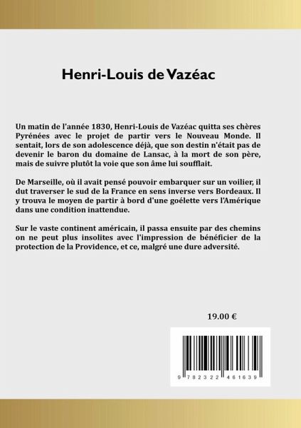 Un matin de l'année 1830, Henri-Louis de Vazéac quitta ses chères Pyrénées avec le projet de partir vers le Nouveau Monde. Il sentait, lors de son adolescence déjà, que son destin n'était pas de devenir le baron du domaine de Lansac, à la mort de son père, mais de suivre plutôt la voie que son âme lui soufflait. De Marseille, où il avait pensé pouvoir embarquer sur un voilier, il dut traverser le sud de la France en sens inverse vers Bordeaux. Il y trouva le moyen de partir à bord d'une goélette vers l'Amérique dans une condition inattendue. Sur le vaste continent américain, il passa ensuite par des chemins on ne peut plus insolites avec l'impression de bénéficier de la protection de la Providence et ce, malgré une dure adversité.