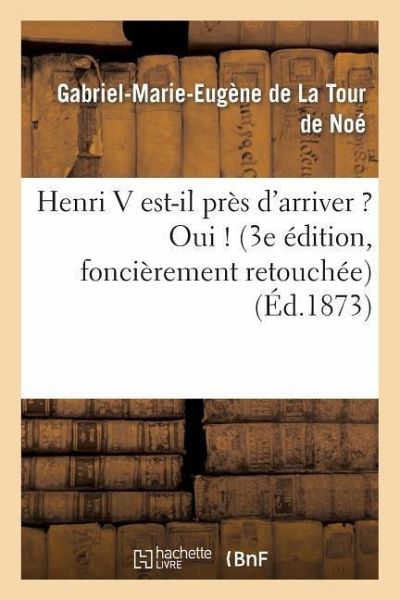 Henri V est-il près d'arriver ? Oui ! (3e édition, foncièrement retouchée) / par l'abbé de La Tour de Noé, ... Date de l'édition originale: 1873 Sujet de l'ouvrage: France (1870-1940, 3e République) Le présent ouvrage s'inscrit dans une politique de conservation patrimoniale des ouvrages de la littérature Française mise en place avec la BNF. HACHETTE LIVRE et la BNF proposent ainsi un catalogue de titres indisponibles, la BNF ayant numérisé ces oeuvres et HACHETTE LIVRE les imprimant à la demande. Certains de ces ouvrages reflètent des courants de pensée caractéristiques de leur époque, mais qui seraient aujourd'hui jugés condamnables. Ils n'en appartiennent pas moins à l'histoire des idées en France et sont susceptibles de présenter un intérêt scientifique ou historique. Le sens de notre démarche éditoriale consiste ainsi à permettre l'accès à ces oeuvres sans pour autant que nous en cautionnions en aucune façon le contenu. Pour plus d'informations, rendez-vous sur www.hachettebnf.fr
