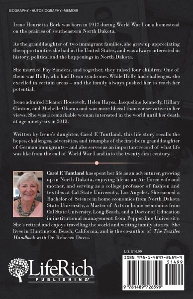 Irene Henrietta Bork was born in 1917 during World War I on a homestead on the prairies of southeastern North Dakota. As the granddaughter of two immigrant families, she grew up appreciating the opportunities she had in the United States, and was always interested in history, politics, and the happenings in North Dakota. She married Fay Sanders, and together, they raised four children. One of them was Holly, who had Down syndrome. While Holly had challenges, she excelled in certain areas - and the family always pushed her to reach her potential. Irene admired Eleanor Roosevelt, Helen Hayes, Jacqueline Kennedy, Hillary Clinton, and Michelle Obama and was more liberal than conservative in her views. She was a remarkable woman interested in the world until her death at age ninety-six in 2013. Written by Irene's daughter, Carol F. Tuntland, this life story recalls the hopes, challenges, adversities, and triumphs of the first-born granddaughter of German immigrants - and also serves as an important record of what life was like from the end of World War I and into the twenty-first century.