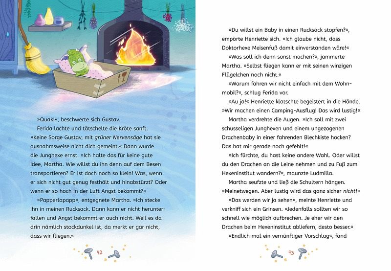 Großtante Martha hat ein riesiges Ei per Post bekommen und will es schon in die Pfanne hauen, als Henriette auffällt, dass das Paket falsch zugestellt worden ist: Es sollte eigentlich zum Zoologischen Hexeninstitut, Fachabteilung Fabelwesen geliefert werden. Fabelwesen?! Plötzlich knackst das Ei und die Schale zerbricht - zum Vorschein kommt ein kleiner Drache! Henriette ist entzückt. Leider hat der freche Drache nur Unfug im Kopf, büxt auf dem Weg zum Zoologischen Hexeninstitut aus und richtet ein riesiges Chaos an. Aber dann hat Henriette eine pfiffige Idee, wie sie mit einem Schlauchboot, einer Picknickdecke und einem kokelnden Drachen an Bord doch noch ihr Ziel erreichen können ...