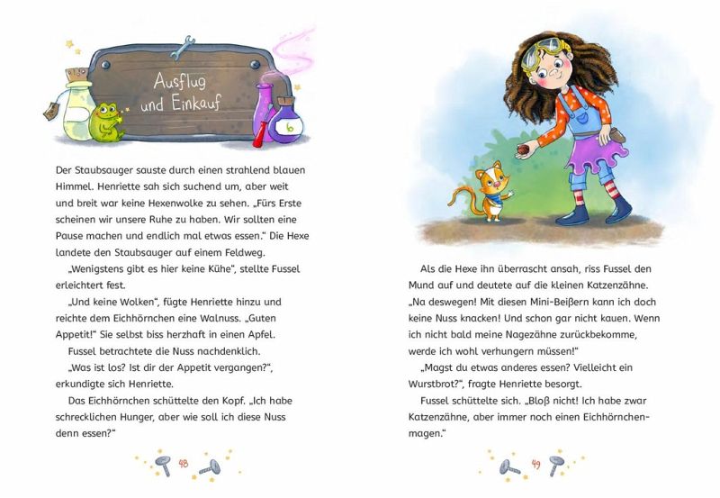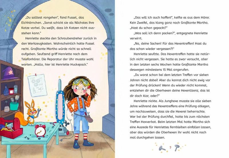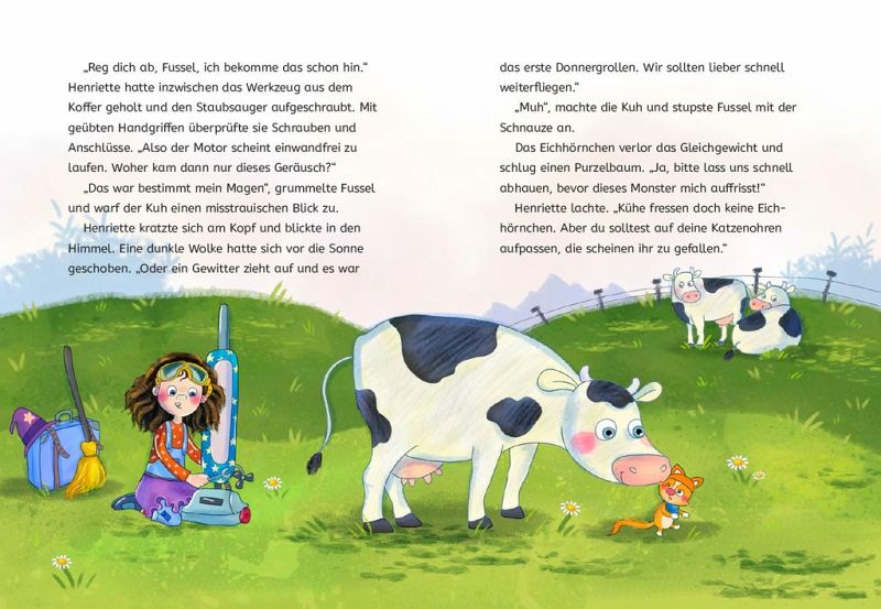 Schon das fröhlich-bunte Cover lässt vermuten, dass Henriette alles andere als eine normale kleine Hexe ist. Statt auf einem Besen, fliegt sie auf einem Staubsauger durch die Gegend, statt Rabe oder Katze ist Eichhörnchen Fussel ihr Hexentier und auch ihr Outfit ist alles andere als hexenlike. Henriette ist ein Mädchen, das statt Hexsprüche auswendig zu lernen lieber kaputte Dinge repariert. Und das kann sie im Gegensatz zum Hexen richtig gut.