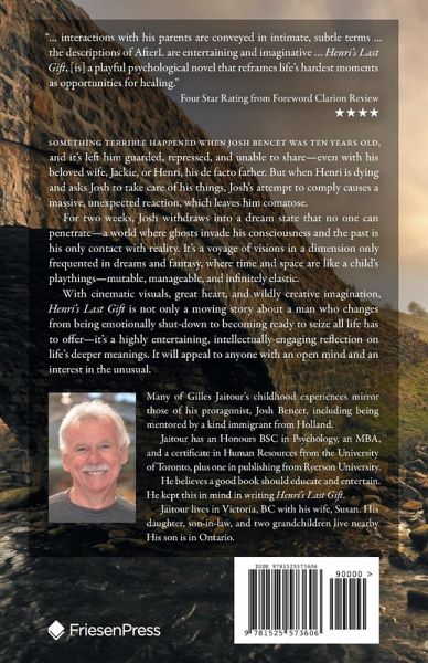 Many of Gilles Jaitour's childhood experiences mirror those of his protagonist, Josh Bencet, including being mentored by a kind immigrant from Holland. Jaitour has an Honours BSC in Psychology, an MBA, and a certificate in Human Resources from the University of Toronto, plus one in publishing from Ryerson University. He believes a good book should educate and entertain. He kept this in mind in writing Henri's Last Gift. Jaitour lives in Victoria, BC with his wife, Susan. His daughter, son-in-law, and two grandchildren live nearby. His son is in Ontario.