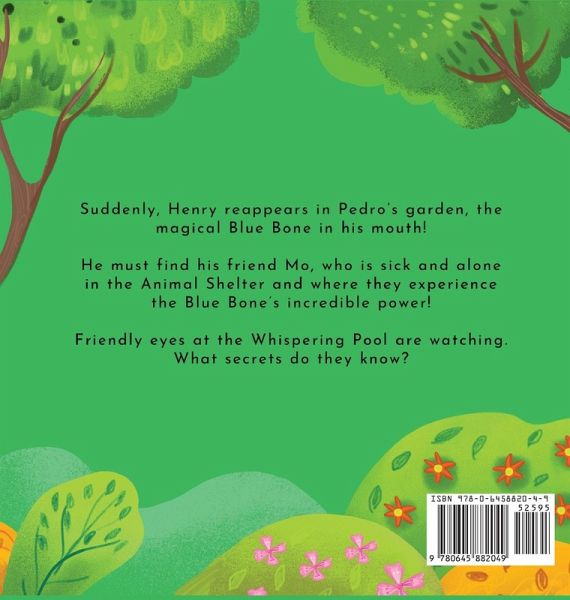 Suddenly, Henry reappears in Pedro's garden, the magical Blue Bone in his mouth! He must find his friend Mo, who is sick and alone in the Animal Shelter and where they experience the Blue Bone's incredible power! Friendly eyes at the Whispering Pool are watching. What secrets do they know?