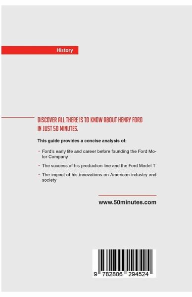Keen to learn but short on time? Get to grips with the life of Henry Ford in next to no time with this concise guide. 50Minutes.com provides a clear and engaging analysis of the life and career of Henry Ford. Prior to the early 20th century, a car was a luxury that only a privileged few could afford, but this all changed thanks to Ford. His moving assembly line drastically reduced the cost of vehicles such as the Ford Model T, and he raised wages so that workers could buy the cars they built. His innovations changed the face of industry, and paved the way for mass production and consumption. In just 50 minutes you will: ¿ Learn about Ford¿s early life and career before founding the Ford Motor Company ¿ Understand the success of his production line and the Ford Model T ¿ Discover the impact of his innovations on American industry and society ABOUT 50MINUTES.COM History & Culture 50MINUTES.COM will enable you to quickly understand the main events, people, conflicts and discoveries from world history that have shaped the world we live in today. Our publications present the key information on a wide variety of topics in a quick and accessible way that is guaranteed to save you time on your journey of discovery.