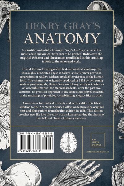 A scientific and artistic triumph, Gray's Anatomy is one of the most iconic anatomical texts ever to be printed. Rediscover the original 1858 text and illustrations republished in this stunning tribute to the renowned work. One of the most distinguished texts on medical anatomy, the thoroughly illustrated pages of Gray's Anatomy have provided generations of readers with an invaluable reference to the human form. The volume was originally produced in 1858 by two young medical professionals, Henry Gray and Henry Vandyke Carter, as an accessible manual for medical students. Over the past two centuries, its practical approach to the subject has proved essential in the teachings of physiology, establishing a legacy like no other. A must-have for medical students and artists alike, this latest addition to the Art Meets Science Collection features the original text and illustrations from the first edition in 1858. This edition breathes new life into the early work while preserving the charm of this beloved classic of human anatomy.