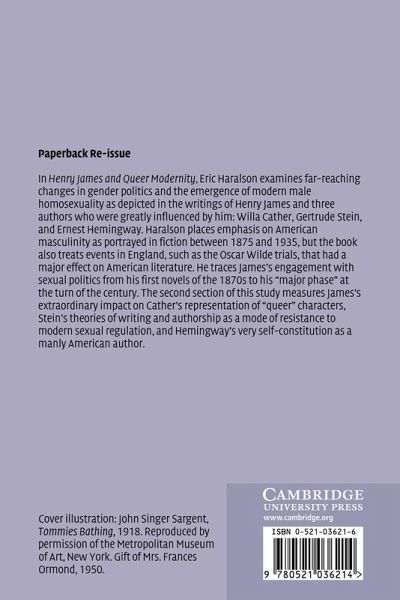 In Henry James and Queer Modernity, Eric Haralson examines far-reaching changes in gender politics and the emergence of modern male homosexuality as depicted in the writings of Henry James and three authors who were greatly influenced by him: Willa Cather, Gertrude Stein and Ernest Hemingway. Haralson places emphasis on American masculinity as portrayed in fiction between 1875 and 1935, but the book also treats events in England, such as the Oscar Wilde trials, that had a major effect on American literature. He traces James's engagement with sexual politics from his first novels of the 1870s to his 'major phase' at the turn of the century. The second section of this study measures James's extraordinary impact on Cather's representation of 'queer' characters, Stein's theories of writing and authorship as a mode of resistance to modern sexual regulation, and Hemingway's very self-constitution as a manly American author.
