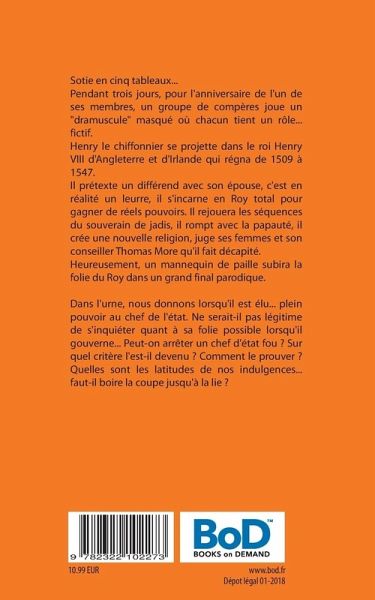 Sotie en cinq tableaux...Pendant trois jours, pour l'anniversaire de l'un de ses membres, un groupe de compères joue un "dramuscule" masqué où chacun tient un rôle... fictif.Henry le chiffonnier se projette dans le roi Henry VIII d'Angleterre et d'Irlande qui régna de 1509 à 1547.Il prétexte un différend avec son épouse, c'est en réalité un leurre, il s'incarne en Roy total pour gagner de réels pouvoirs. Il rejouera les séquences du souverain de jadis, il rompt avec la papauté, il crée une nouvelle religion, juge ses femmes et son conseiller Thomas More qu'il fait décapité.Heureusement, un mannequin de paille subira la folie du Roy dans un grand final parodique.Dans l'urne, nous donnons lorsqu'il est élu... plein pouvoir au chef de l'état. Ne serait-il pas légitime de s'inquiéter quant à sa folie possible lorsqu'il gouverne... Peut-on arrêter un chef d'état fou ? Sur quel critère l'est-il devenu ? Comment le prouver ? Quelles sont les latitudes de nos indulgences... faut-il boire la coupe jusqu'à la lie ?