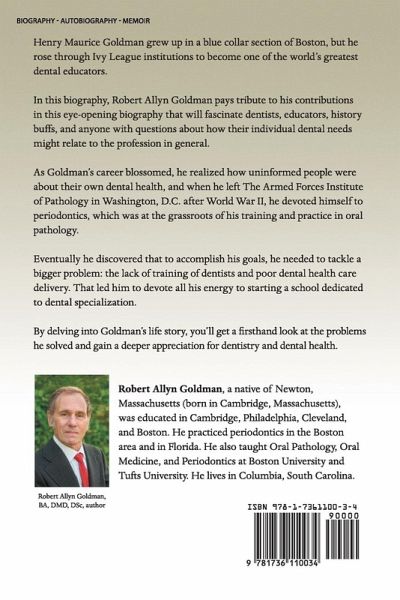 Henry Maurice Goldman grew up in a blue collar section of Boston, but he rose through Ivy League institutions to become one of the world's greatest dental educators. In this biography, Robert Allyn Goldman pays tribute to his contributions in this eye-opening biography that will fascinate dentists, educators, history buffs, and anyone with questions about how their individual dental needs might relate to the profession in general. As Goldman's career blossomed, he realized how uninformed people were about their own dental health, and when he left The Armed Forces Institute of Pathology in Washington, D.C. after World War II, he devoted himself to periodontics, which was at the grassroots of his training and practice in oral pathology. Eventually he discovered that to accomplish his goals, he needed to tackle a bigger problem: the lack of training of dentists and poor dental health care delivery. That led him to devote all his energy to starting a school dedicated to dental specialization. By delving into Goldman's life story, you'll get a firsthand look at the problems he solved and gain a deeper appreciation for dentistry and dental health.