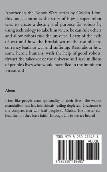Another in the Robot Wars series by Golden Lion, this book continues the story of how a super robot tries to create a destiny and purpose for robots by using technology to take him where he can rule others and allow robots rule the universe. Learn of the evils of war and how the breakdown of the use of hard currency leads to war and suffering. Read about how some heroic humans, with the help of good robots, thwart the takeover of the universe and save millions of people's lives who would have died in the imminent Firestorm!