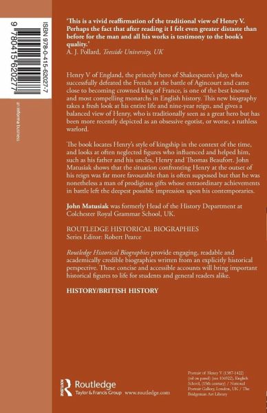 Henry V of England, the princely hero of Shakespeare's play, who successfully defeated the French at the Battle of Agincourt and came close to becoming crowned King of France, is one of the best known and most compelling monarchs in English history. This new biography takes a fresh look at his entire life and nine year reign, and gives a balanced view of Henry, who is traditionally seen as a great hero but has been more recently depicted as an obsessive egotist or, worse, a ruthless warlord. The book locates Henry's style of kingship in the context of the time, and looks at often neglected other figures who influenced and helped him, such as his father and his uncles, Henry and Thomas Beaufort. John Matusiak shows that the situation confronting Henry at the outset of his reign was far more favourable than is often supposed but that he was nonetheless a man of prodigious gifts whose extraordinary achievements in battle left the deepest possible impression upon his contemporaries.