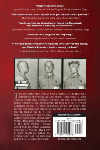 "Everyone who reads Henry becomes a witness."––Jack Mayer, author of Life in a Jar: The Irena Sendler Project and Before the Court of Heaven 2018 IBPA Benjamin Franklin Award – Silver for Biography 2018 Best Published Nonfiction – Arizona Authors Association 2017 Gold for Adult Non-Fiction - The Wishing Shelf Book Awards (UK) This incredible true story is both a witness to the Holocaust through Polish eyes and the story of how Henry Zguda, a Polish Catholic swimmer, survives Nazi concentration camps Auschwitz and Buchenwald by his wits, humor, luck, and friends. At times humorous, always gut-honest, this account fills a huge gap in historical accounts of Poles during World War II. May 30, 1942, Kraków Poland. German SS guards arrest Henry Zguda on a dark narrow street for one reason only: he was Polish at a time Germany swore to destroy all of Poland. Two weeks later he arrives at Auschwitz and is now Prisoner #39551. In March 1943 he is transferred to Buchenwald near Weimar Germany. There he is labeled Prisoner #10948 May 3, 1945, Dachau Germany. Near death, Henry writes home for the first time in three years: "Beloved mother, I am alive." Katrina Shawver met Henry in 2002 when she wrote for the Arizona Republic, and after one meeting offered to write his story. They soon became close friends and friendship remains a theme throughout. Relevant history is woven throughout the account, resulting in a unique perspective of both Jewish and Polish suffering in Nazi-occupied Poland. Henry's story is backed by meticulous research and original documents and photos, many in print for the first time. If you are a discerning adult looking for an intelligent read, this book is for you. "…a top 'must have' acquisition for any collection strong in Holocaust survival accounts."–– D. Donovan, Senior Reviewer, Midwest Book Review "Highly recommended."--James Conroyd Martin, author of The Poland Trilogy and The Boy Who Wanted Wings
