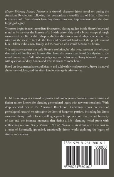 Henry: Prisoner, Patriot, Pioneer is a visceral, character-driven novel set during the American Revolution, following the extraordinary true-life arc of Henry Bush-a fifteen-year-old Pennsylvania farm boy thrust into war, imprisonment, and the slow forging of legacy. The story begins in raw, immediate first person, placing readers inside Henry's body and mind as he survives the horrors of a British prison ship and a brutal escape through enemy territory. By the third chapter, the lens shifts to a close third-person perspective, widening the view to include the lives and emotional burdens of the people around him-fellow militia men, family, and the woman who would become his future. This structure captures not only Henry's evolution, but the deep, resonant cost of a war that reshaped families and futures alike. From the frozen trenches of Brandywine to the moral unraveling of Sullivan's campaign against the Iroquois, Henry is forced to grapple with questions of duty, honor, and what it means to come home. Based on documented ancestral history and told with lyrical precision, Henry is a novel about survival, love, and the silent kind of courage it takes to stay.