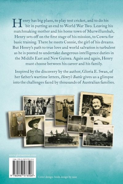 Henry has big plans, to play test cricket for Australia, and to do his bit in putting an end to World War Two. Leaving his matchmaking mother and his hometown of Murwillumbah, Henry sets off on the first stage of his mission,to Cowra for basic training. There he meets the girl of his dreams. But the path to true love is not clear, with other suitors competing for Connie's love. Henry's mission of world salvation is turbulent as he is assigned to intelligence duties and faces extreme dangers in the Middle East where the Australian Forces are combating the threat of the German and Italian forces in North Africa. Again and again, Henry must choose between his career and his family. With his life with Connie hanging in the balance, Henry continues with the 2/3rd Pioneer Battalion of the AIF into the Papua New Guinea jungle where he faces the biggest test of his trust and his courage. Inspired by the discovery by the author, Gloria E. Swan, of her father's wartime letters, Henry's Battle gives us a glimpse of the challenges of World War Two that were faced by thousands of Australian families.