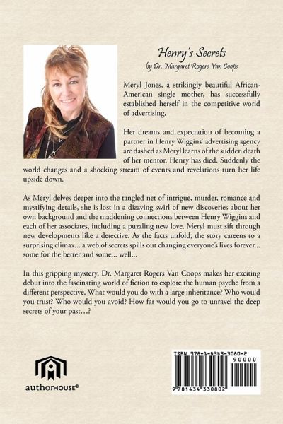 Meryl Jones, a strikingly beautiful African-American woman, has successfully established herself in the competitive world of advertising. She is a single mother of a twenty-year-old daughter, Julie, who is embarking on a professional singing career. Her dreams and expectation of becoming a partner in Henry Wiggins' advertising agency are dashed as Meryl learns of the sudden death of her mentor. Henry has died. Suddenly the world changes and a shocking stream of events and revelations turn her life upside down. As Meryl delves deeper into the tangled net of intrigue, murder, romance and mystifying details, she is lost in a dizzying swirl of new discoveries about her own background and the maddening connections between Henry Wiggins and each of her associates. Meryl must sift through new developments like a detective. As the facts unfold, the story careens to a surprising climax... a web of secrets spills out changing everyone's lives forever... some for the better and some... well... In this gripping mystery, Margaret Rogers Van Coops makes her exciting debut into the fascinating world of fiction to explore the human psyche from a different perspective. What would you do with a large inheritance? Who would you trust? Who would you avoid? How far would you go to unravel the deep secrets of your past.?