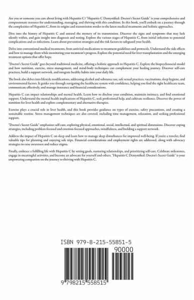 Are you or someone you care about living with Hepatitis C? "Hepatitis C Demystified: Doctor's Secret Guide" is your comprehensive and compassionate resource for understanding, managing, and thriving with this condition. In this book, you'll embark on a journey through the complexities of Hepatitis C, from its origins and transmission modes to the latest medical treatments and holistic approaches. Dive into the history of Hepatitis C and unravel the mystery of its transmission. Discover the signs and symptoms that may lurk silently within, and gain insight into diagnosis and testing. Explore the various stages of Hepatitis C, from initial infection to potential complications and co-infections. Learn about prevention strategies and the risk factors to safeguard your health. Delve into conventional medical treatments, from antiviral medications to treatment guidelines and protocols. Understand the side effects and how to manage them while monitoring your treatment's progress. Explore the potential need for liver transplantation and the emerging treatment options that offer hope. "Doctor's Secret Guide" goes beyond traditional medicine, offering a holistic approach to Hepatitis C. Explore the biopsychosocial model and how nutrition, exercise, stress management, and mind-body techniques can complement your healing journey. Discover self-care practices, build a support network, and integrate healthy habits into your daily life. The book also delves into lifestyle modifications, addressing alcohol and substance use, safe sexual practices, vaccinations, sleep hygiene, and environmental factors. It guides you through navigating the healthcare system with confidence, helping you find the right healthcare team, communicate effectively, and manage insurance and financial considerations. Hepatitis C can impact relationships and mental health. Learn how to disclose your condition, maintain intimacy, and find emotional support. Understand the mental health implications of Hepatitis C, seek professional help, and cultivate resilience. Discover the power of nutrition for liver health and explore complementary and alternative therapies. Exercise plays a crucial role in liver health, and this book provides guidance on types of exercise, safety precautions, and creating a sustainable routine. Stress management techniques are also covered, including time management, relaxation, and seeking professional support. "Doctor's Secret Guide" emphasizes self-care, exploring physical, emotional, social, intellectual, and spiritual dimensions. Discover coping strategies, including problem-focused and emotion-focused approaches, mindfulness, and building a support network. Address the impact of Hepatitis C on sleep and learn how to manage sleep disturbances for improved well-being. If you're a traveler, find valuable tips for planning and enjoying safe trips. Financial considerations and employment rights are addressed, along with advocacy strategies to raise awareness and reduce stigma. Finally, embrace a fulfilling life with Hepatitis C by setting goals, nurturing relationships, and prioritizing self-care. Celebrate milestones, engage in meaningful activities, and become an advocate for yourself and others. "Hepatitis C Demystified: Doctor's Secret Guide" is your empowering companion on the journey to thriving with Hepatitis C.