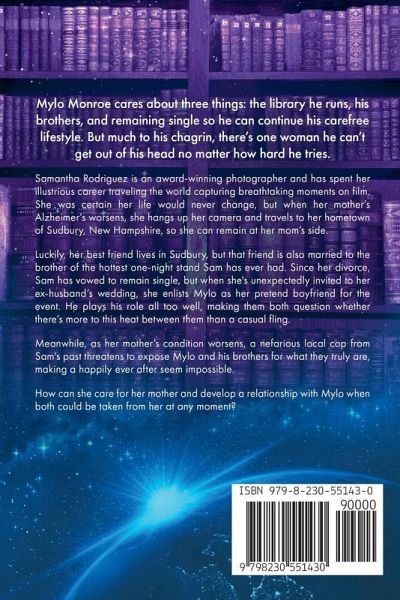 Mylo Monroe cares about three things: the library he runs, his brothers, and remaining single so he can continue his carefree lifestyle. But much to his chagrin, there's one woman he can't get out of his head no matter how hard he tries. Samantha Rodriguez is an award-winning photographer and has spent her illustrious career traveling the world capturing breathtaking moments on film. She was certain her life would never change, but when her mother's Alzheimer's worsens, she hangs up her camera and travels to her hometown of Sudbury, New Hampshire, so she can remain at her mom's side. Luckily, her best friend lives in Sudbury, but that friend is also married to the brother of the hottest one-night stand Sam has ever had. Since her divorce, Sam has vowed to remain single, but when she's unexpectedly invited to her ex-husband's wedding, she enlists Mylo as her pretend boyfriend for the event. He plays his role all too well, making them both question whether there's more to this heat between them than a casual fling. Meanwhile, as her mother's condition worsens, a nefarious local cop from Sam's past threatens to expose Mylo and his brothers for what they truly are, making a happily ever after seem impossible. How can she care for her mother and develop a relationship with Mylo when both could be taken from her at any moment?