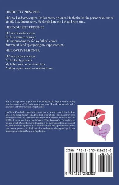 HIS PRETTY PRISONER He's my handsome captor. I'm his pretty prisoner. He thinks I'm the person who ruined his life. I say I'm innocent. He should hate me. I should hate him... Excerpt: A few hours later, I wake up to Kevin saying, "Hello, sleeping beauty." Oh s**t, he's already back? I remember his words: "I'll be back around 5 PM. At that time, I expect to find you waiting for me on the bed without any clothes on." Gulping, I ask, "What time is it?" "Well after 5. And you're neither on the bed nor naked." His voice is calm, but I know he's not going to let my disobedience slide, even if it was unintentional. I shiver. "Are you going to punish me?" He pulls at my camisole. "What do you think?" he asks in a deceptively gentle voice. WORD COUNT: 9,500 HIS EXQUISITE PRISONER He's my beautiful captor. I'm his exquisite prisoner. He's imprisoning me for my father's crimes. But what if I end up enjoying my imprisonment? WORD COUNT: 9,600 EXCERPT: "You are the most exquisite thing that I've ever seen," Hayden says. "But you intrigued me in other ways." I laugh humorlessly. "Well, as long as you kidnapped me for non-shallow reasons..." "If your father becomes distressed about your disappearance-" "He won't." Ignoring me, he finishes, "That's just a sweet bonus." "God, you're a psycho." And to think I sort of enjoyed his company last night. He sits on the bed, then puts me on his lap. My body burns as he pulls off the sheets and he stares at my bare body. "Are you going to force yourself on me?" I ask. I wish I was a cool action movie heroine who could fashion a deadly weapon out of something in this room. But I'm only me, a weak, stupid girl who has no hope of fighting him off. "I'm going to have you enjoy yourself," he breathes into my ear. HIS LOVELY PRISONER He's my gorgeous captor. I'm his lovely prisoner. My father stole money from him. And my captor wants to steal my heart... WORD COUNT: 9,200