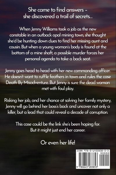 She came to find answers - she discovered a trail of secrets... When Jenny Williams took a job as the new constable in an outback opal mining town, she thought she'd be hunting down clues to find her missing aunt and cousin. But when a young woman's body is found at the bottom of a mine shaft, a possible murder forces her personal agenda to take a back seat. Jenny goes head to head with her new commanding officer. He doesn't want to ruffle feathers in town and rules the case Death By Misadventure. But Jenny is sure the dead woman met with foul play. Risking her job, and her chance at solving her family mystery, Jenny will go behind her boss's back and uncover not only a killer, but a lead that could reveal a decade of corruption. This case could be the link she's been hoping for. But it might just end her career. Or even her life!