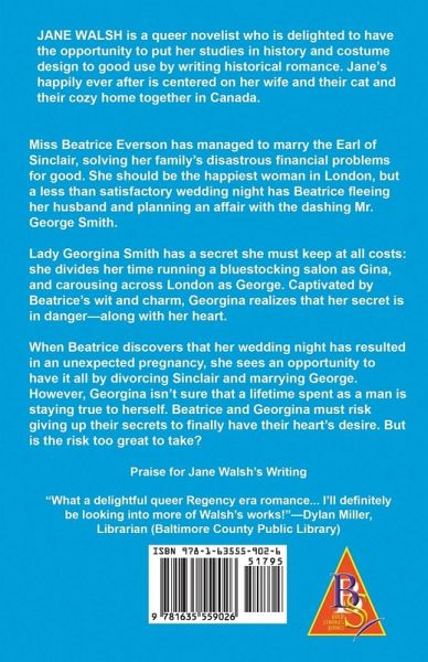 Miss Beatrice Everson has managed to marry the Earl of Sinclair, solving her family's disastrous financial problems for good. She should be the happiest woman in London, but a less than satisfactory wedding night has Beatrice fleeing her husband and planning an affair with the dashing Mr. George Smith. Lady Georgina Smith has a secret she must keep at all costs: she divides her time running a bluestocking salon as Gina, and carousing across London as George. Captivated by Beatrice's wit and charm, Georgina realizes that her secret is in danger--along with her heart. When Beatrice discovers that her wedding night has resulted in an unexpected pregnancy, she sees an opportunity to have it all by divorcing Sinclair and marrying George. However, Georgina isn't sure that a lifetime spent as a man is staying true to herself. Beatrice and Georgina must risk giving up their secrets to finally have their heart's desire. But is the risk too great to take?