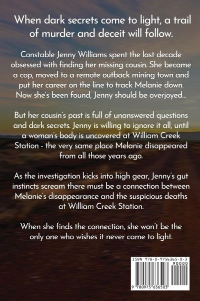 When dark secrets come to light, a trail of murder and deceit will follow. Constable Jenny Williams spent the last decade obsessed with finding her missing cousin. She became a cop, moved to a remote outback mining town and put her career on the line to track Melanie down. Now she's been found, Jenny should be overjoyed... But her cousin's past is full of unanswered questions and dark secrets. Jenny is willing to ignore it all, until a woman's body is uncovered at William Creek Station - the very same place Melanie disappeared from all those years ago. As the investigation kicks into high gear, Jenny's gut instincts scream there must be a connection between Melanie's disappearance and the suspicious deaths at William Creek Station. When she finds the connection, she won't be the only one who wishes it never came to light.