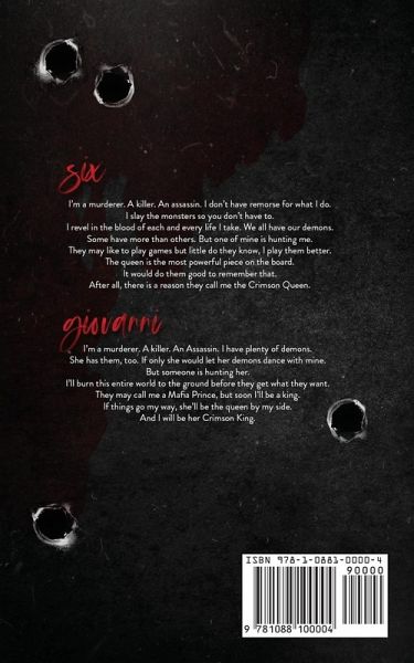 SIX I'm a murderer. A killer. An assassin. I don't have remorse for my sins. I slay the monsters so you don't have to and revel in the blood of each and every life I take. We all have our demons. Some have more than others, but one of mine is hunting me. They may like to play games but little do they know, I play them better. The queen is the most powerful piece on the board. It would do them good to remember that. After all, there is a reason they call me the Crimson Queen. GIOVANNI I'm a murderer. A killer. An Assassin. I have plenty of demons. She has them, too. If only she would let her demons dance with mine. But someone is hunting her. I'll burn this entire world to the ground before they get what they want. They may call me a Mafia Prince, but soon I'll be a king. If things go my way, she'll be the queen by my side, and I'll be her Crimson King.