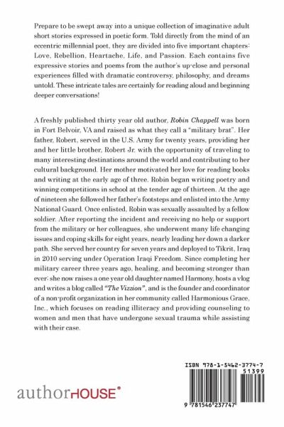 Prepare to be swept away into a unique collection of imaginative adult short stories expressed in poetic form. Told directly from the mind of an eccentric millennial poet, they are divided into five important chapters: Love, Rebellion, Heartache, Life, and Passion. Each contains five expressive stories and poems from the authors up-close and personal experiences filled with dramatic controversy, philosophy, and dreams untold. These intricate tales are certainly for reading aloud and beginning deeper conversations!