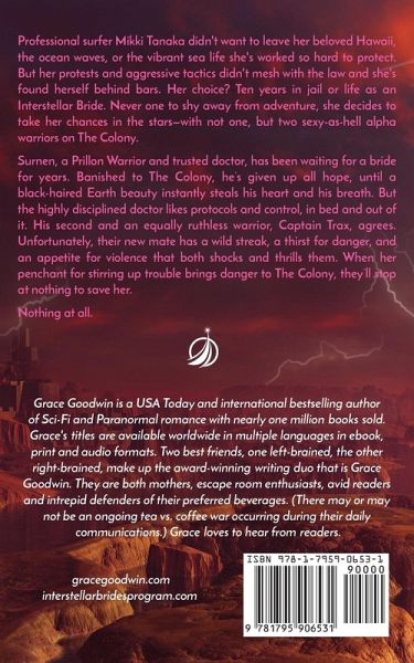 Professional surfer Mikki Tanaka didn't want to leave her beloved Hawaii, the ocean waves, or the vibrant sea life she's worked so hard to protect. But her protests and aggressive tactics didn't mesh with the law and she's found herself behind bars. Her choice? Ten years in jail or life as an Interstellar Bride. Never one to shy away from adventure, she decides to take her chances in the stars-with not one, but two sexy-as-hell alpha warriors on The Colony. Surnen, a Prillon Warrior and trusted doctor, has been waiting for a bride for years. Banished to The Colony, he's given up all hope, until a black-haired Earth beauty instantly steals his heart and his breath. But the highly disciplined doctor likes protocols and control, in bed and out of it. His second and an equally ruthless warrior, Captain Trax, agrees. Unfortunately, their new mate has a wild streak, a thirst for danger, and an appetite for violence that both shocks and thrills them. When her penchant for stirring up trouble brings danger to The Colony, they'll stop at nothing to save her. Nothing at all.