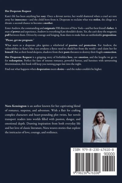 Her Desperate Request Kate's life has been anything but easy. Once a devout novice, her world shattered when a cruel act tore away her innocence-and the child born from it. Desperate to reclaim what was stolen, she clings to a dream: a second chance to become a mother. Enter Andrew, the commanding and enigmatic FBI director of New York-and her best friend's father. A man of power and experience, Andrew is everything Kate shouldn't desire. Yet, she can't deny the magnetic pull between them. Driven by courage and longing, Kate dares to make him an unthinkable proposition: "Please, get me pregnant." What starts as a desperate plea ignites a whirlwind of passion and protection. For Andrew, the vulnerability in Kate's blue eyes awakens a fierce need to shield her from the world-and claim her for himself. But as their bond deepens, shadows from their pasts threaten to destroy their fragile connection. Her Desperate Request is a gripping story of forbidden love, raw emotion, and the lengths we go to for redemption. Perfect for fans of intense romance, powerful heroes, and heroines with unwavering determination, this book will keep you turning pages late into the night. Find out what happens when desperation meets desire-and the stakes couldn't be higher.