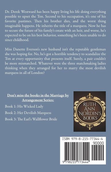 Dr. Derek Westward has been happy living his life doing everything possible to upset the Ton. Second to his occupation, it's one of his favorite pastimes. Then his brother dies, and the worst thing imaginable happens. He inherits the title of a marquess. Now he has to secure the future of his family's estate with an heir, and worse, he's expected to be on his best behavior, something he's been unable to do since childhood. Miss Danette Everson has given up on ever marrying. At twenty-five, she's resigned herself to spinsterhood, until her friend decides she'd be better off married. Before she knows it, she's a bride. But her new husband isn't the reputable gentleman she was hoping for. No, he's got a horrible tendency to scandalize the Ton at every opportunity that presents itself. Surely, a pair couldn't be more mismatched. Whatever were the three matchmaking ladies thinking when they arranged for her to marry the most devilish marquess in all of London?