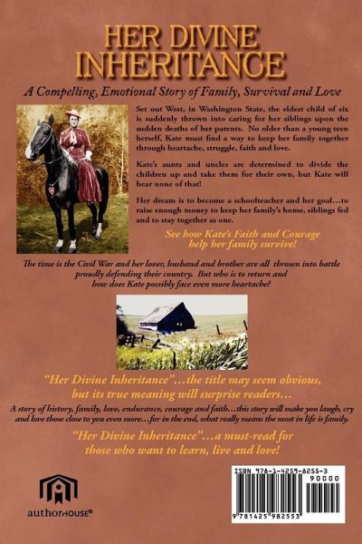 "Her Divine Inheritance"..A Compelling, Emotional Story of Family, Survival and Love. "Her Divine Inheritance".The title may seem obvious, but its true meaning will surprise readers. Set out West, in Washington State, the eldest child of six is suddenly thrown into solely caring for her siblings upon the sudden deaths of her parents. No older than a young teen herself, Kate must find a way to keep her family together through heartache, struggle, faith and love. Kate's aunts and uncles are determined to divide the children up and take them for their own, but Kate will hear none of that! Her dream is to become a schoolteacher and her goal... to raise enough money to keep her family's home, siblings fed and to stay together as one. The time is the Civil War and her lover, husband and brother are thrown into war proudly defending their country. But who is to return and how does Kate possibly face even more heartache? A story of history, family love, endurance, courage and faith.this story will make you cry, laugh and love those close to you even more.for in the end, what really means the most in life is family~ Her Divine Inheritance...a must-read for those who want to learn, live and love~