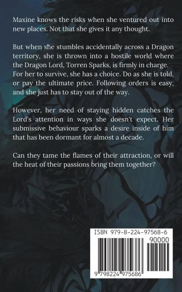 A dragon shifter paranormal romance Maxine knows the risks when she ventured out into new places. Not that she gives it any thought. But when she stumbles accidentally across a Dragon territory, she is thrown into a hostile world where the Dragon Lord, Torren Sparks, is firmly in charge. For her to survive, she has a choice. Do as she is told, or pay the ultimate price. Following orders is easy, and she just has to stay out of the way. However, her need of staying hidden catches the Lord's attention in ways she doesn't expect. Her submissive behaviour sparks a desire inside of him that has been dormant for almost a decade. Can they tame the flames of their attraction, or will the heat of their passions bring them together?