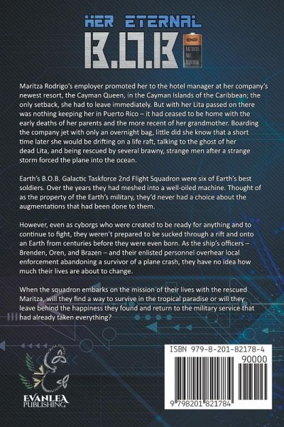 Maritza Rodrigo's employer promoted her to the hotel manager at her company's newest resort, the Cayman Queen, in the Cayman Islands of the Caribbean; the only set back, she had to leave immediately. But with her Lita passed on there was nothing keeping her in Puerto Rico - it had ceased to be home with the early deaths of her parents and the more recent of her grandmother. Boarding the company jet with only an overnight bag, little did she know that a short time later she would be drifting on a life raft, talking to the ghost of her dead Lita, and being rescued by several brawny, strange men after a strange storm forced the plane into the ocean. Earth's B.O.B. Galactic Taskforce 2nd Flight Squadron were six of Earth's best soldiers. Over the years they had meshed into a well-oiled machine. Thought of as the property of the Earth's military, they'd never had a choice about the augmentations that had been done to them. However, even as cyborgs who were created to be ready for anything and to continue to fight, they weren't prepared to be sucked through a rift and onto an Earth from centuries before they were even born. As the ship's officers - Brenden, Oren, and Brazen - and their enlisted personnel overhear local enforcement abandoning a survivor of a plane crash, they have no idea how much their lives are about to change. When the squadron embarks on the mission of their lives with the rescued Maritza, will they find a way to survive in the tropical paradise or will they leave behind the happiness they found and return to the military service that had already taken everything?