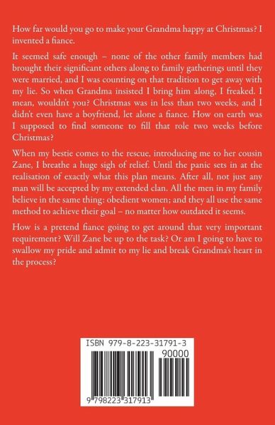 How far would you go to make your Grandma happy at Christmas? I invented a fiance. It seemed safe enough – none of the other family members had brought their significant others along to family gatherings until they were married, and I was counting on that tradition to get away with my lie. So when Grandma insisted I bring him along, I freaked. I mean, wouldn't you? Christmas was in less than two weeks, and I didn't even have a boyfriend, let alone a fiance. How on earth was I supposed to find someone to fill that role two weeks before Christmas? When my bestie comes to the rescue, introducing me to her cousin Zane, I breathe a huge sigh of relief. Until the panic sets in at the realisation of exactly what this plan means. After all, not just any man will be accepted by my extended clan. All the men in my family believe in the same thing: obedient women; and they all use the same method to achieve their goal – no matter how outdated it seems. How is a pretend fiance going to get around that very important requirement? Will Zane be up to the task? Or am I going to have to swallow my pride and admit to my lie and break Grandma's heart in the process?