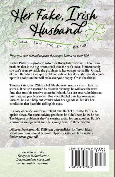 It's a marriage of convenience for three months. But will it turn into something more? Rachel Parker is a problem solver for Bixby International. There is no problem that is too big or too small that she can't solve. Unfortunately, she can't seem to tackle the problems in her own personal life. Or lack of one. But when a unique problem lands on her desk, she quickly comes up with a solution that will make everyone happy. Or so she thinks. Thomas Yates, the 12th Earl of Glenbourne, needs a wife in less than a week. If he isn't married by his next birthday, he will lose the trust fund that runs his massive estate in Ireland. As a last resort, he hires an international problem solver. But when Rachel puts her own name forward, he can't help but wonder what her agenda is. But it's her conditions that have him rolling his eyes. It's only when she arrives in Ireland, that Rachel turns the Earl's life upside down. She starts solving problems he didn't even know he had. The biggest problem is they're starting to fall for one another. But it's a business arrangement and she's going home in three months. Different backgrounds. Different personalities. Different ideas about how thing should be done. Opposites attract, but can they find common ground? Each book in the Escape to Ireland series is a standalone novel and can be read in any order.