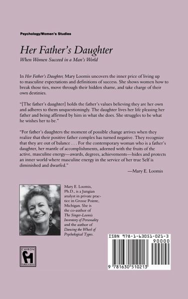 In Her Father's Daughter, Mary Loomis uncovers the inner price of living up to masculine expectations and definitions of success. She shows women how to break those ties, move through their hidden shame, and take charge of their own destinies. "[The father's daughter] holds the father's values believing they are her own and adheres to them unquestioningly. The daughter lives her life pleasing her father and being affirmed by him in what she does. She struggles to be what he wishes her to be." "For father's daughters the moment of possible change arrives when they realize that their positive father complex has turned negative. They recognize that they are out of balance ... For the contemporary woman who is a father's daughter, her mantle of accomplishments, adorned with the fruits of the active, masculine energy-awards, degrees, achievements-hides and protects an inner world where masculine energy in the service of her true Self is diminished and dwarfed." -Mary E. Loomis Mary E. Loomis, Ph.D ., is a Jungian analyst in private practice in Grosse Pointe, Michigan. She is the co-author of The Singer-Loomis Inventory of Personality and the author of Dancing the Wheel of Psychological Types.