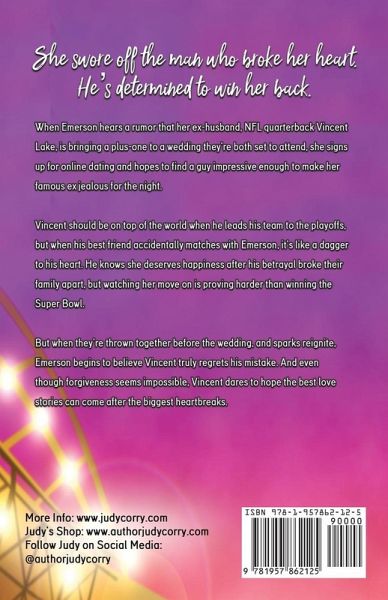 She swore off the man who broke her heart. He's determined to win her back. When Emerson hears a rumor that her ex-husband, NFL quarterback Vincent Lake, is bringing a plus-one to a wedding they're both set to attend, she signs up for online dating and hopes to find a guy impressive enough to make her famous ex jealous for the night. Vincent should be on top of the world when he leads his team to the playoffs, but when his best friend accidentally matches with Emerson, it's like a dagger to his heart. He knows she deserves happiness after his betrayal broke their family apart, but watching her move on is proving harder than winning the Super Bowl. But when they're thrown together before the wedding, and sparks reignite, Emerson begins to believe Vincent truly regrets his mistake. And even though forgiveness seems impossible, Vincent dares to hope the best love stories can come after the biggest heartbreaks.