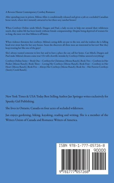 After spending years in prison, Milena Allen is unexpectedly paroled and given a job at a secluded Canadian horse ranch where she's instantly attracted to her three sexy rancher bosses! When Cowboys Online sends Mitch, Daegen and Paul, a lady ex-con to help out around their wilderness ranch, they realize life has been lonely without female companionship. Despite being deprived of women for so long, the men vow that Milena is off limits. When violence threatens her cowboys, Milena's caring skills are put to the test, and she realizes she is falling head over straw hats for her sexy bosses. Soon she discovers all three men are interested in her too! But they keep treating her like one of the guys! She's always wanted someone to love her and to have a place she can call her home. Can Mitch, Daegen and Paul make Milena's dreams come true? Or will a horrific mistake by Cowboys Online unravel everything? Cowboys Online Series Book One - Cowboys for Christmas (Moose Ranch), Book Two - Cowboys in Her Pocket (Moose Ranch), Book Three - Loving Her Cowboys (Moose Ranch), Book Four - Cowboys in Her Heart (Moose Ranch), Book Five - Always Her Cowboys (Moose Ranch), Book Six - Her Forever Cowboys (Snowy Creek Ranch).