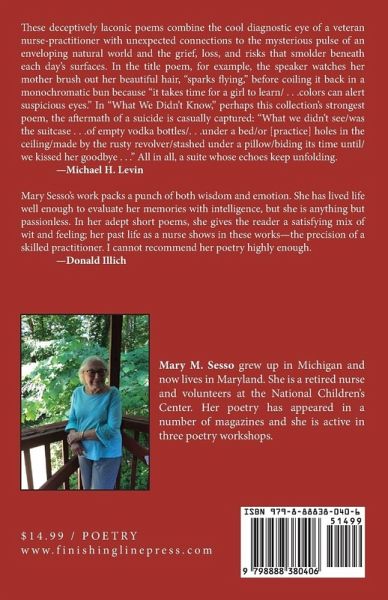 These deceptively laconic poems combine the cool diagnostic eye of a veteran nurse-practitioner with unexpected connections to the mysterious pulse of an enveloping natural world and the grief, loss, and risks that smolder beneath each day's surfaces. In the title poem, for example, the speaker watches her mother brush out her beautiful hair, "sparks flying," before coiling it back in a monochromatic bun because "it takes time for a girl to learn/ . . .colors can alert suspicious eyes." In "What We Didn't Know," perhaps this collection's strongest poem, the aftermath of a suicide is casually captured: "What we didn't see/was the suitcase . . .of empty vodka bottles/. . .under a bed/or [practice] holes in the ceiling/made by the rusty revolver/stashed under a pillow/biding its time until/we kissed her goodbye . . ." All in all, a suite whose echoes keep unfolding.-Michael H. Levin Mary Sesso's work packs a punch of both wisdom and emotion. She has lived life well enough to evaluate her memories with intelligence, but she is anything but passionless. In her adept short poems, she gives the reader a satisfying mix of wit and feeling; her past life as a nurse shows in these works-the precision of a skilled practitioner. I cannot recommend her poetry highly enough.-Donald Illich