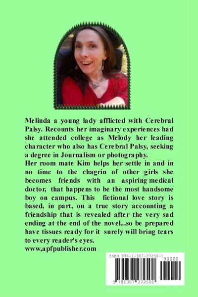 . This is a fictional love story based, in part, on a true story that will touch your heart and soul all about Melody a young lady afflicted with Cerebral Palsy and her experiences attending college in pursuit of a degree in Journalism or photography. Her room mate Kim helps her settle in and in no time to the chagrin of other girls she becomes friends with an aspiring medical doctor, the most handsome boy on campus love blooms ... but the hearts are broken...
