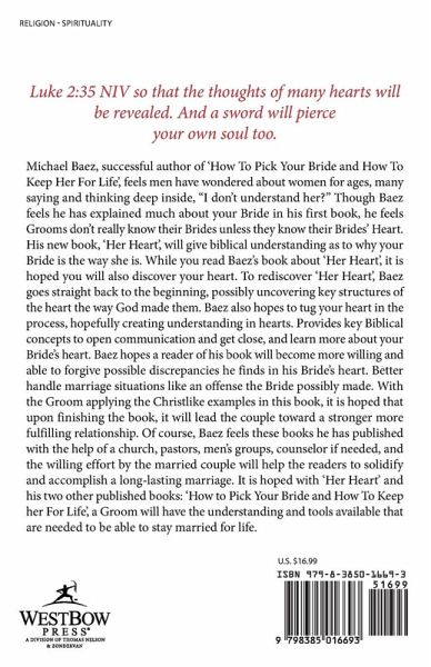 Luke 2:35 NIV so that the thoughts of many hearts will be revealed. And a sword will pierce your own soul too. Michael Baez, successful author of 'How To Pick Your Bride and How To Keep Her For Life', feels men have wondered about women for ages, many saying and thinking deep inside, "I don't understand her?" Though Baez feels he has explained much about your Bride in his first book, he feels Grooms don't really know their Brides unless they know their Brides' Heart. His new book, 'Her Heart', will give biblical understanding as to why your Bride is the way she is. While you read Baez's book about 'Her Heart', it is hoped you will also discover your heart. To rediscover 'Her Heart', Baez goes straight back to the beginning, possibly uncovering key structures of the heart the way God made them. Baez also hopes to tug your heart in the process, hopefully creating understanding in hearts. Provides key Biblical concepts to open communication and get close, and learn more about your Bride's heart. Baez hopes a reader of his book will become more willing and able to forgive possible discrepancies he finds in his Bride's heart. Better handle marriage situations like an offense the Bride possibly made. With the Groom applying the Christlike examples in this book, it is hoped that upon finishing the book, it will lead the couple toward a stronger more fulfilling relationship. Of course, Baez feels these books he has published with the help of a church, pastors, men's groups, counselor if needed, and the willing effort by the married couple will help the readers to solidify and accomplish a long-lasting marriage. It is hoped with 'Her Heart' and his two other published books: 'How to Pick Your Bride and How To Keep her For Life', a Groom will have the understanding and tools available that are needed to be able to stay married for life.