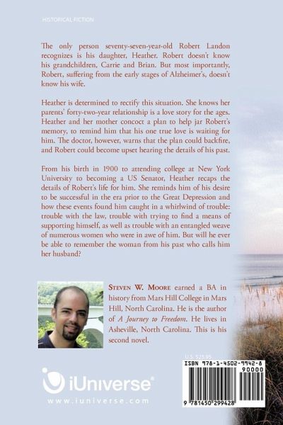 The only person seventy-seven-year-old Robert Landon recognizes is his daughter, Heather. Robert doesn't know his grandchildren, Carrie and Brian. But most importantly, Robert, suffering from the early stages of Alzheimer's, doesn't know his wife, Jessica. Heather is determined to rectify this situation. She knows her parents' forty-two-year relationship is a love story for the ages. Heather and Jessica concoct a plan to help jar Robert's memory, to remind him that his one true love is waiting for him. The doctor, however, warns that the plan could backfire, and Robert could become upset hearing the details of his past. From his birth in 1900 to attending college at New York University to becoming a US Senator, Heather recaps the details of Robert's life for him. She reminds him of his desire to be successful in the era prior to the Great Depression and how these events found him caught in a whirlwind of trouble: trouble with the law, trouble with trying to find a means of supporting himself, as well as trouble with an entangled weave of numerous women who were in awe of him. But will he ever be able to remember the woman from his past who calls him her husband?