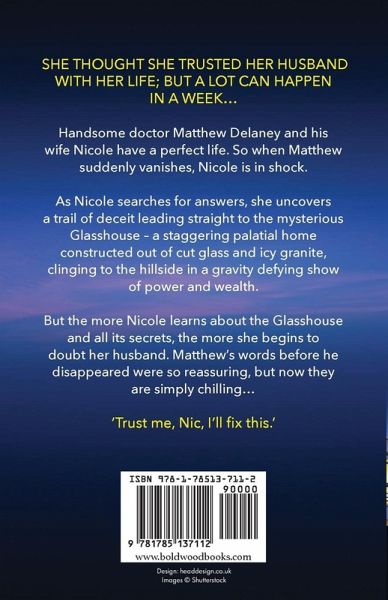 She thought she trusted her husband with her life; but a lot can happen in a week... Handsome doctor Matthew Delaney and his wife Nicole have a perfect life. So when Matthew suddenly vanishes, Nicole is in shock. As Nicole searches for answers, she uncovers a trail of deceit leading straight to the mysterious Glasshouse - a staggering palatial home constructed out of cut glass and icy granite, clinging to the hillside in a gravity defying show of power and wealth. But the more Nicole learns about the Glasshouse and all its secrets, the more she begins to doubt her husband. Matthew's words before he disappeared were so reassuring, but now they are simply chilling... 'Trust me, Nic, I'll fix this.'